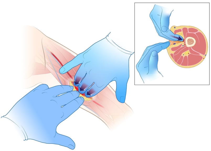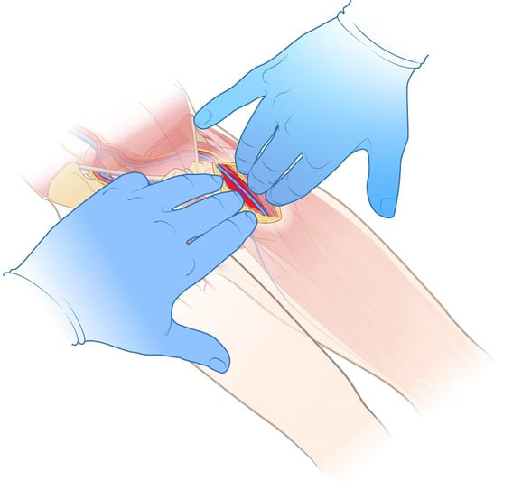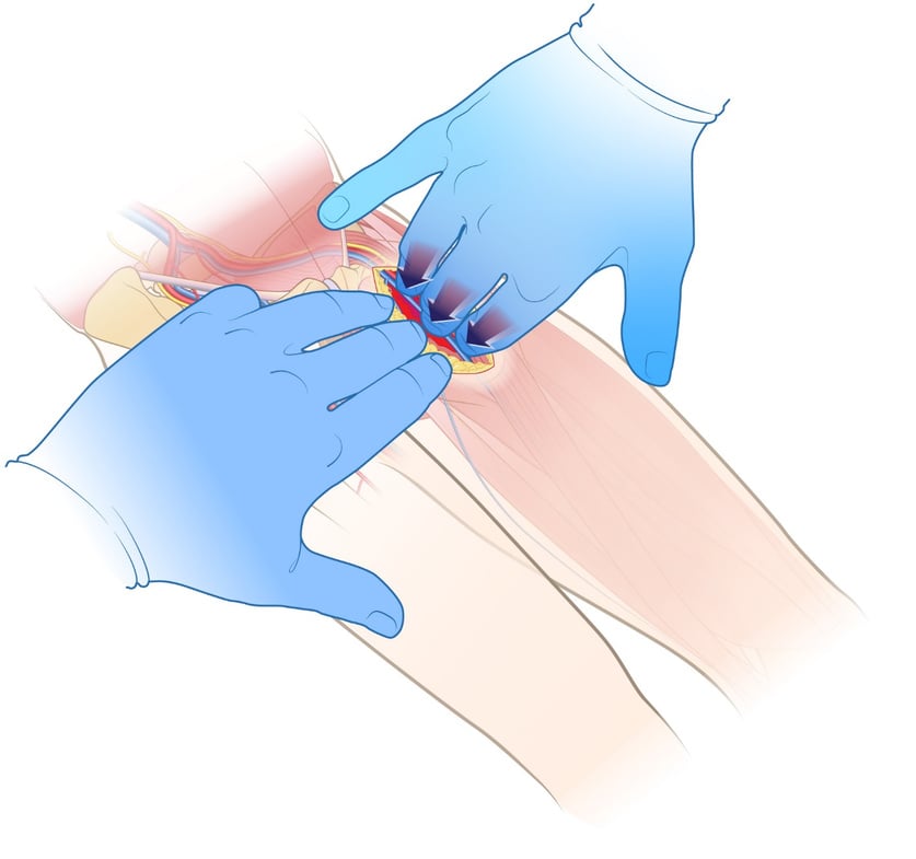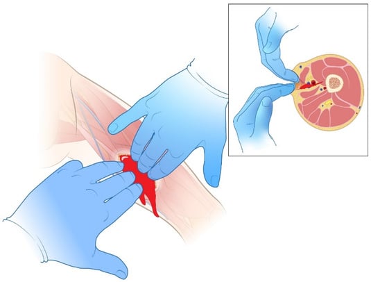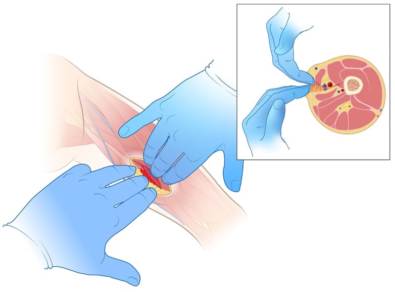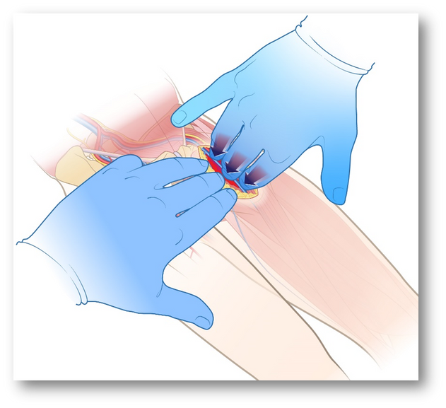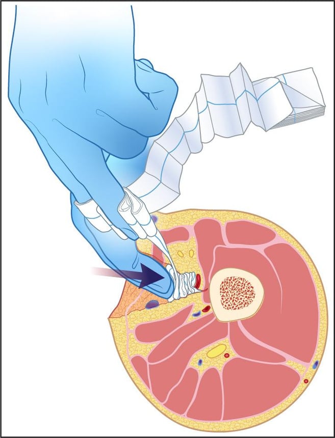 Перев'яжіть всю порожнину рани зберігаючи при цьому тиск у судині. Після повного заповнення потримайте протягом трьох (3) хвилин, перш ніж накладати давлячу пов'язку.