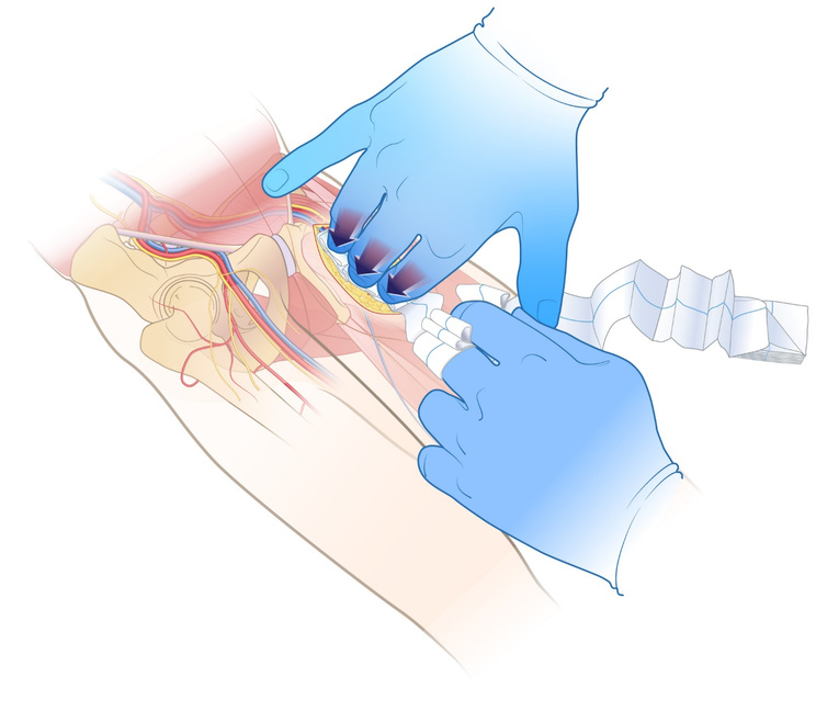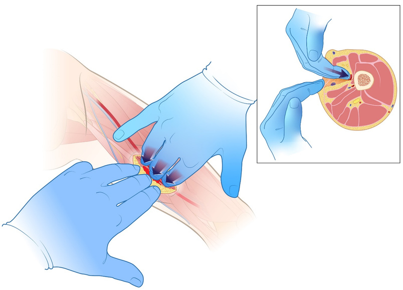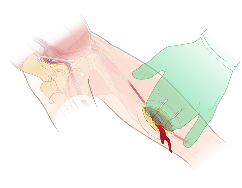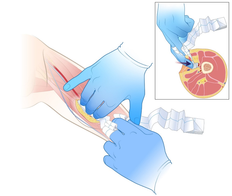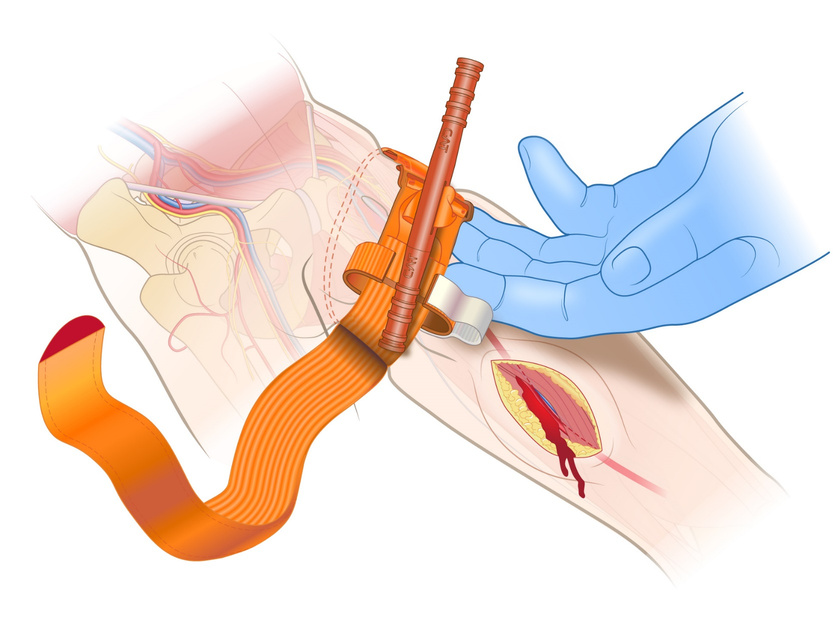 Перев'яжіть всю порожнину рани зберігаючи при цьому тиск у судині. Після повного заповнення потримайте протягом трьох (3) хвилин, перш ніж накладати давлячу пов'язку.